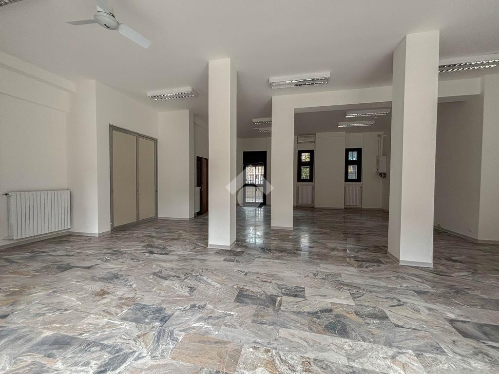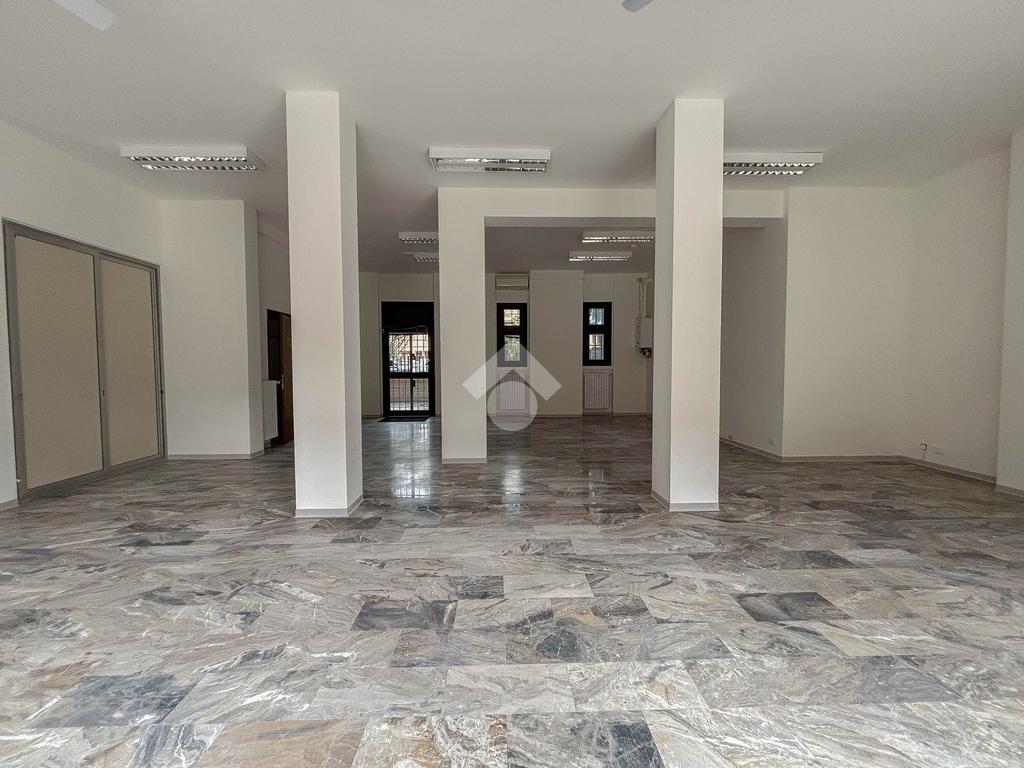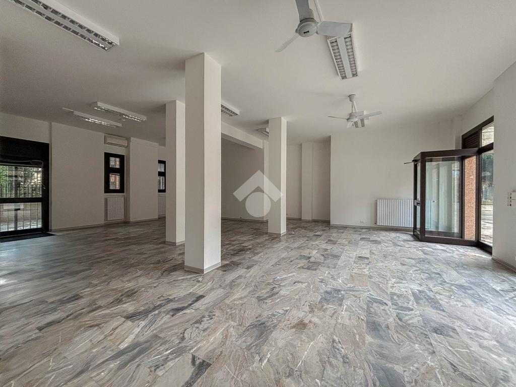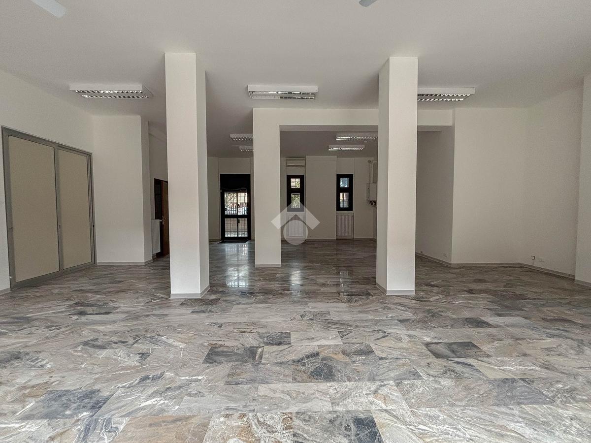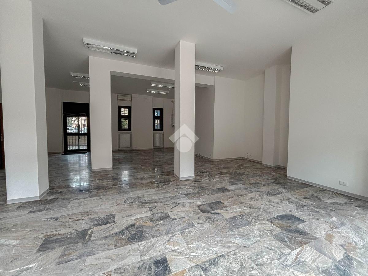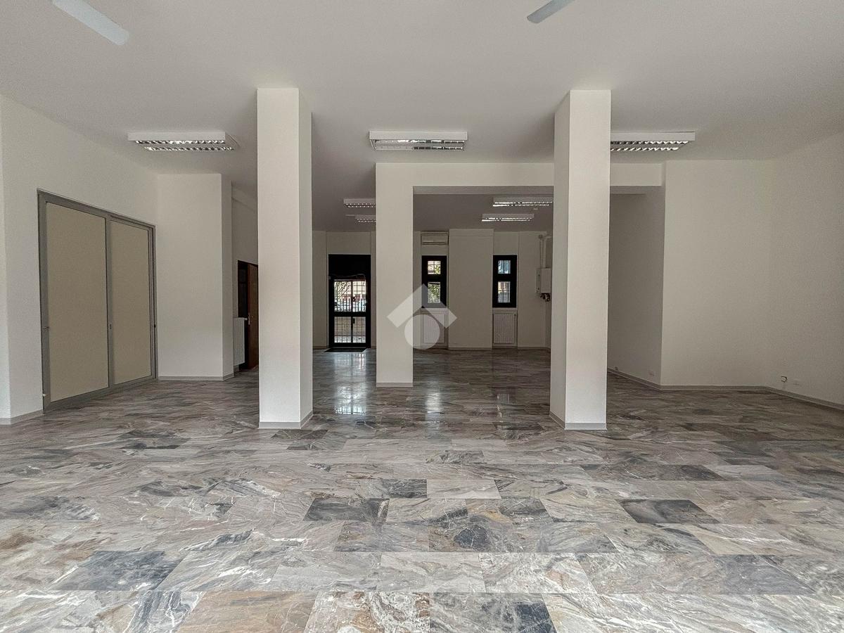 L'ufficio misura 100 metri quadrati ed è situato al piano terra di una palazzina che si sviluppa su tre livelli. La soluzione, ristrutturata nel corso del 2025, è attualmente un open space ed è dotata di un servizio igienico a norma disabili. L'ambiente è particolarmente luminoso grazie alla presenza di tre grandi vetrine. L’immobile è dotato del sistema di riscaldamento e condizionamento, dell’impianto elettrico e quello di illuminazione. Inoltre, possiede la predisposizione per il sistema di allarme, doppio ingresso ed è cablato.