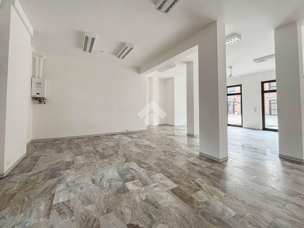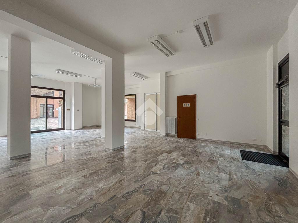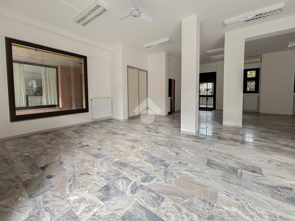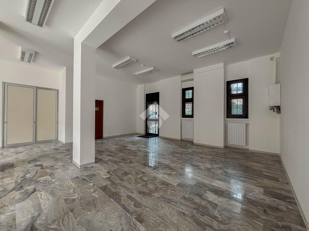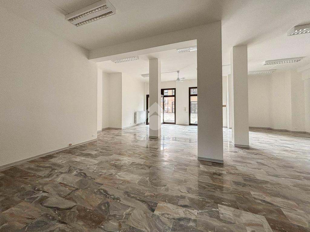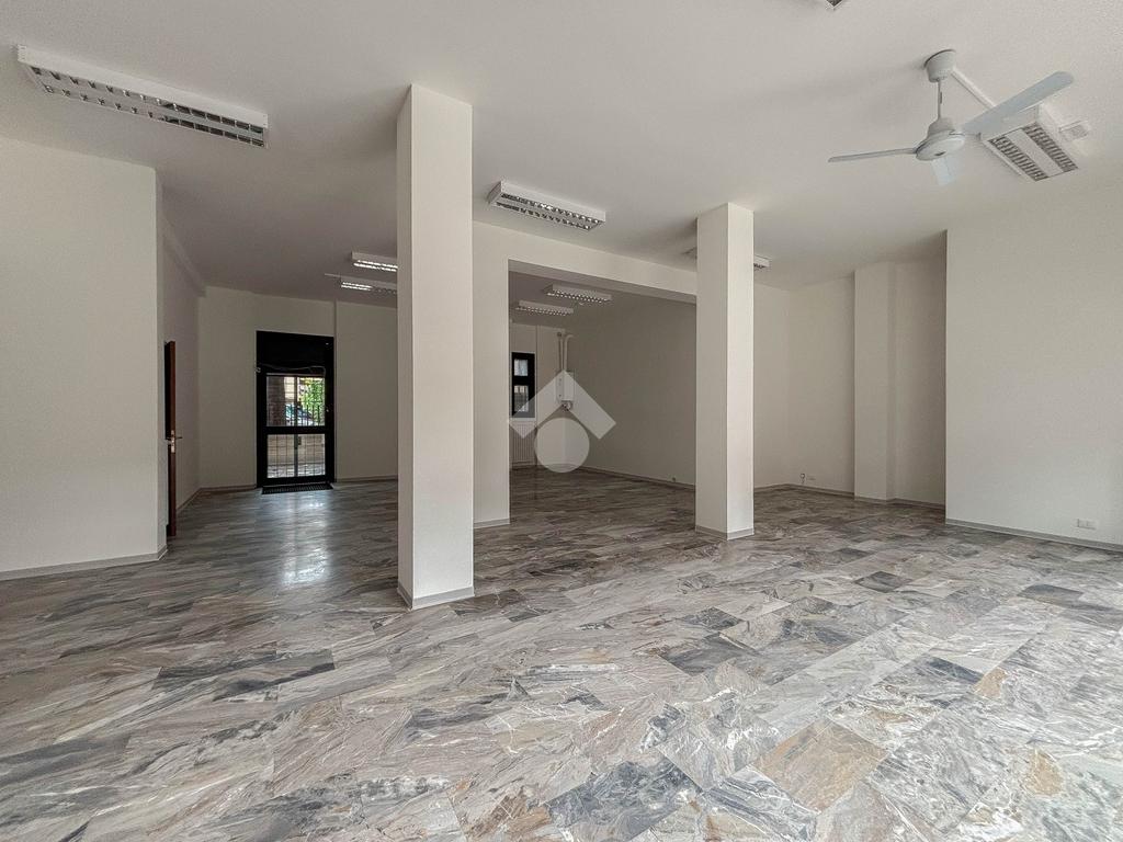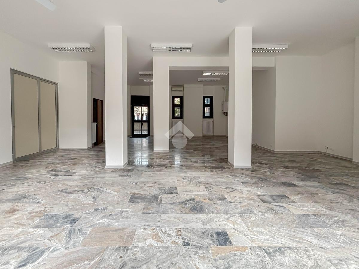 L'ufficio misura 100 metri quadrati ed è situato al piano terra di una palazzina che si sviluppa su tre livelli. La soluzione, ristrutturata nel corso del 2025, è attualmente un open space ed è dotata di un servizio igienico a norma disabili. L'ambiente è particolarmente luminoso grazie alla presenza di tre grandi vetrine. L’immobile è dotato del sistema di riscaldamento e condizionamento, dell’impianto elettrico e quello di illuminazione. Inoltre, possiede la predisposizione per il sistema di allarme, doppio ingresso ed è cablato.
