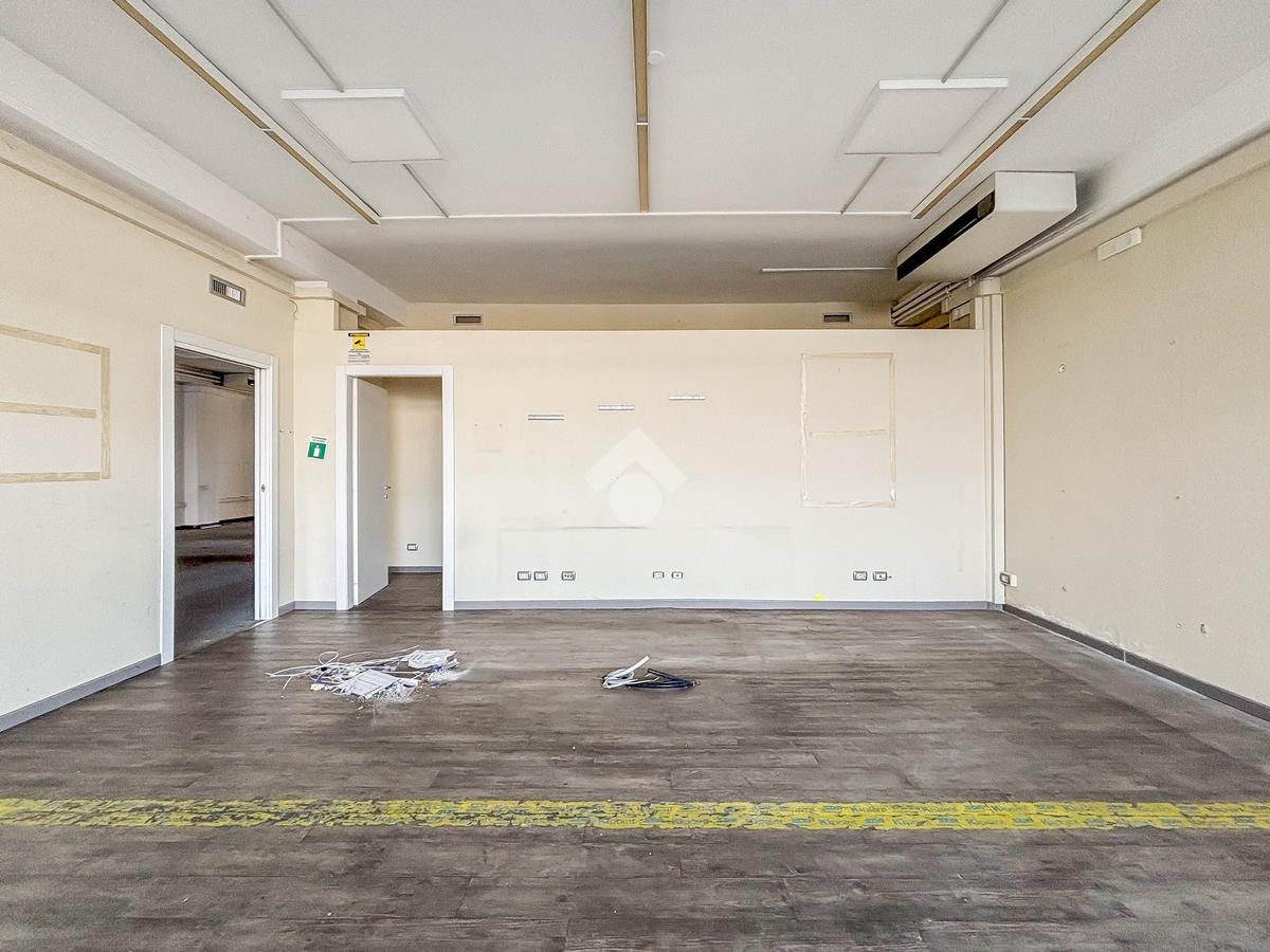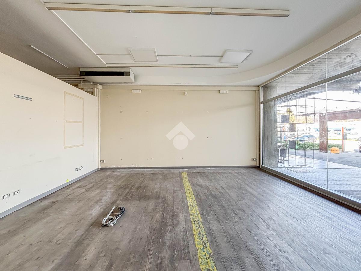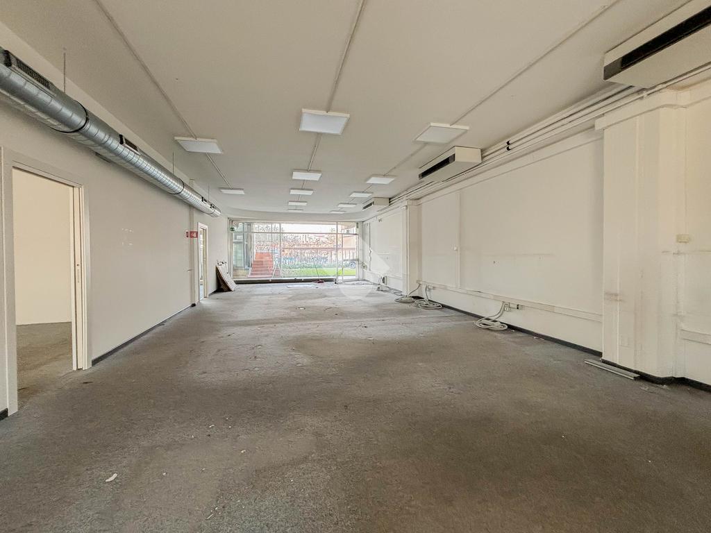 Il negozio misura 200 metri quadrati ed è situato al piano terra di una palazzina commerciale che si sviluppa su tre livelli. La soluzione è attualmente divisa in due locali, ciascuno di 100 metri quadrati, ed è dotata di due servizi igienici privati. L'ambiente è luminoso grazie alla presenza di due vetrine. Il locale possiede l'impianto di riscaldamento e condizionamento autonomo, l'impianto elettrico e quello di illuminazione. L'immobile, cablato, presenta un accesso a norma disabili.