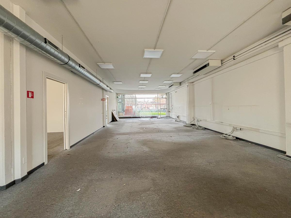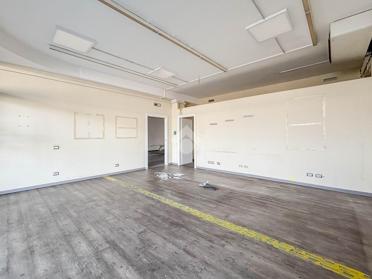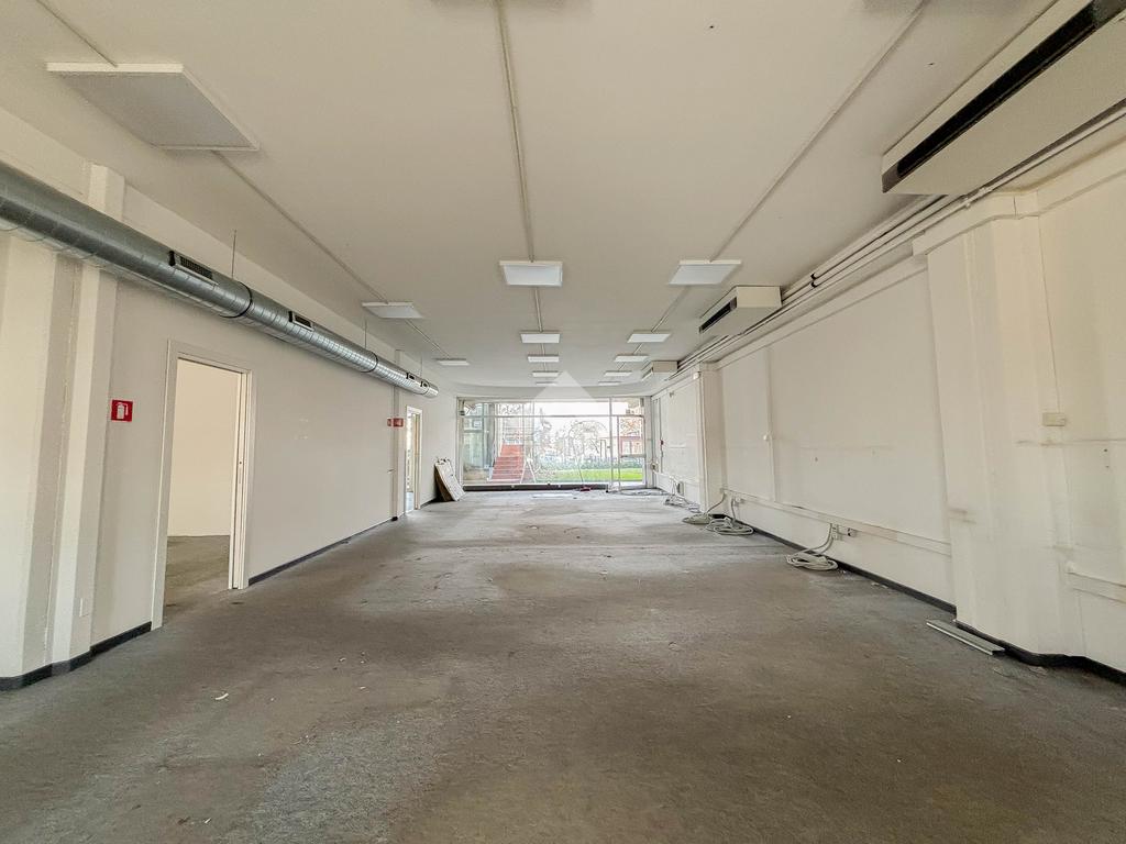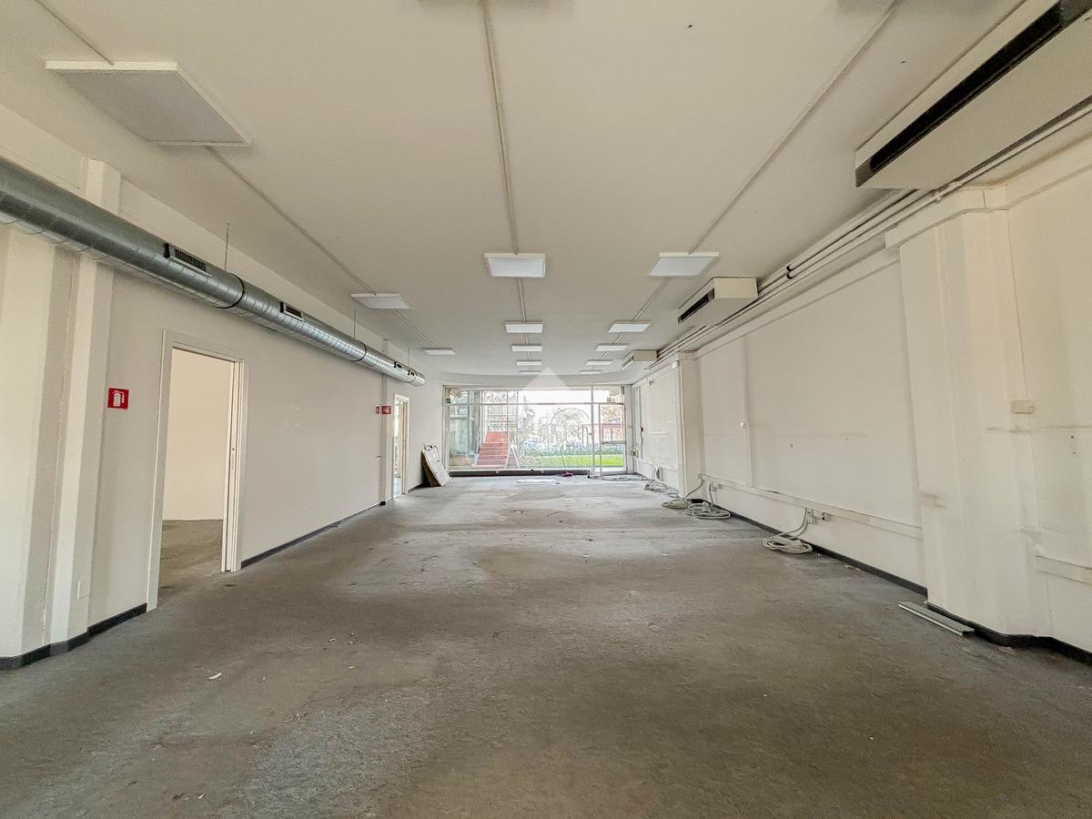 Il negozio misura 200 metri quadrati ed è situato al piano terra di una palazzina commerciale che si sviluppa su tre livelli. La soluzione è attualmente divisa in due locali, ciascuno di 100 metri quadrati, ed è dotata di due servizi igienici privati. L'ambiente è luminoso grazie alla presenza di due vetrine. Il locale possiede l'impianto di riscaldamento e condizionamento autonomo, l'impianto elettrico e quello di illuminazione. L'immobile, cablato, presenta un accesso a norma disabili.