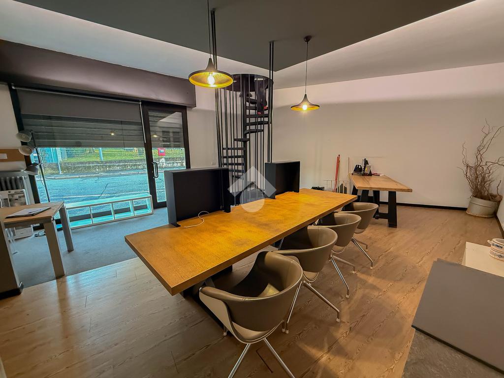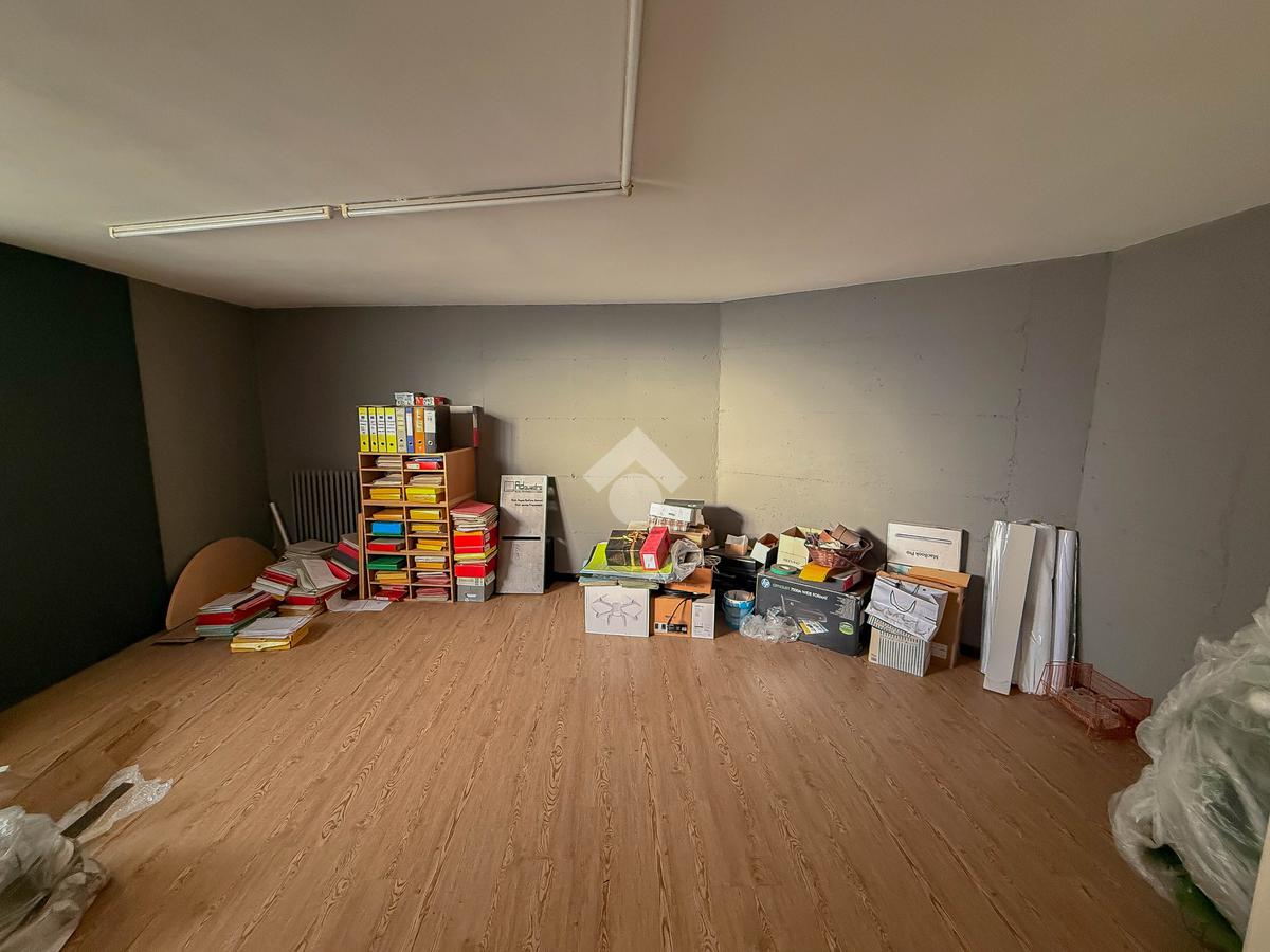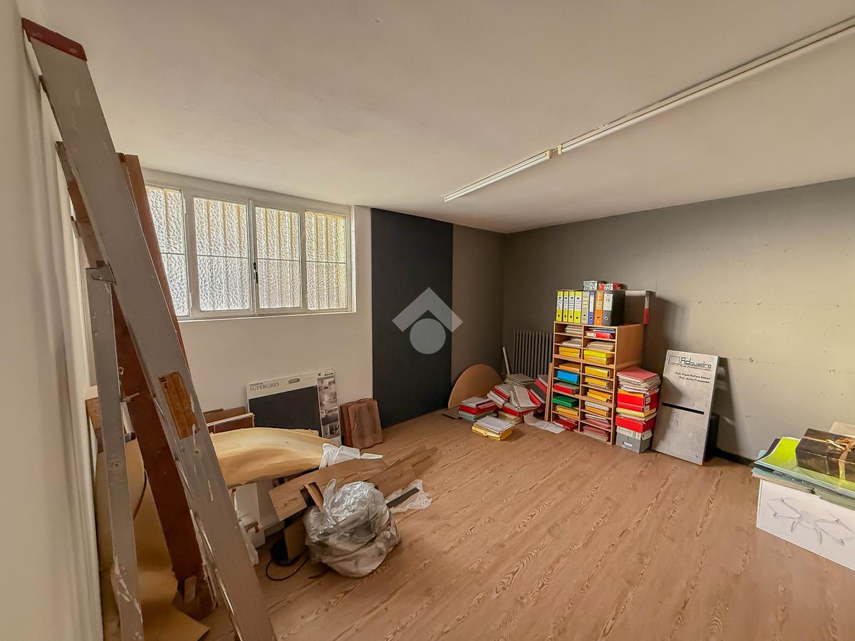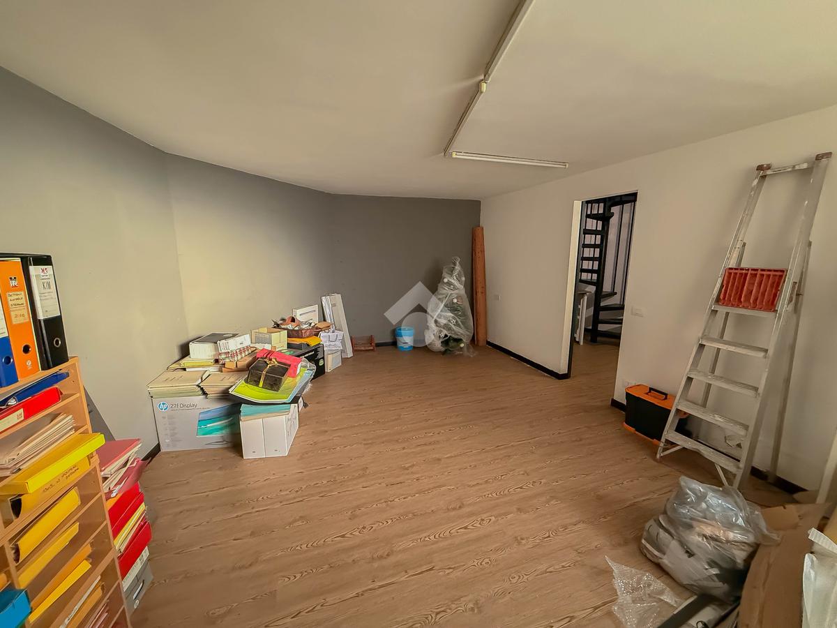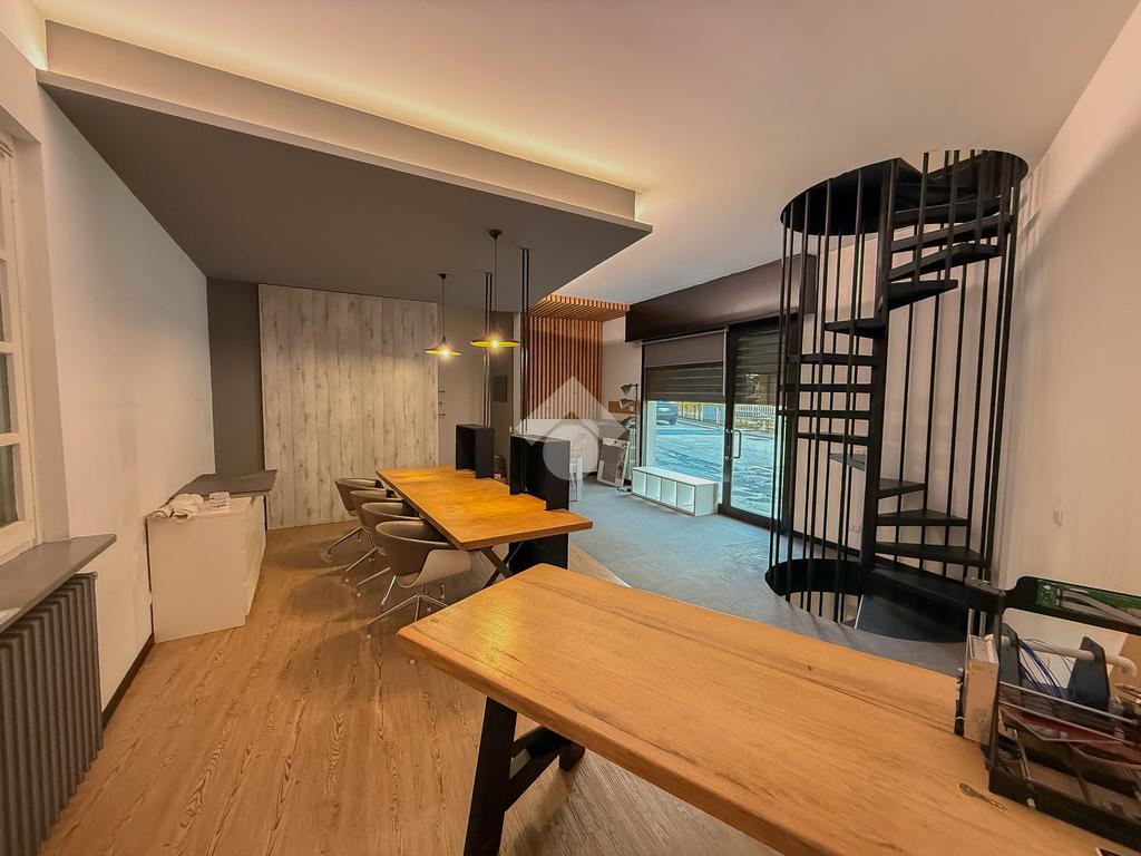 L'ufficio misura complessivamente 140 metri quadrati e si sviluppa su più livelli in una palazzina di tre piani. Al piano terra troviamo un open space di circa 45 metri quadrati al quale si collega, tramite una scala a chiocciola, il piano primo che presenta un ulteriore locale di circa 45 metri quadrati. Al piano seminterrato è presente un magazzino di circa 50 metri quadrati, anch'esso collegato internamente, e dotato di servizio igienico finestrato con antibagno. La soluzione, controsoffittata, è servita dall'impianto di riscaldamento e condizionamento centralizzato, dall'impianto elettrico e da quello di illuminazione. L'ambiente, cablato, è luminoso grazie alla presenza di una vetrina e presenta una posizione ad angolo con doppio ingresso a norma disabili, tramite una saracinesca automatica.